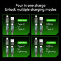 🔌 4-in-1 Design: Features 4 plugs: USB A, Lightning, and Double Type-C, offering versatility for various devices.