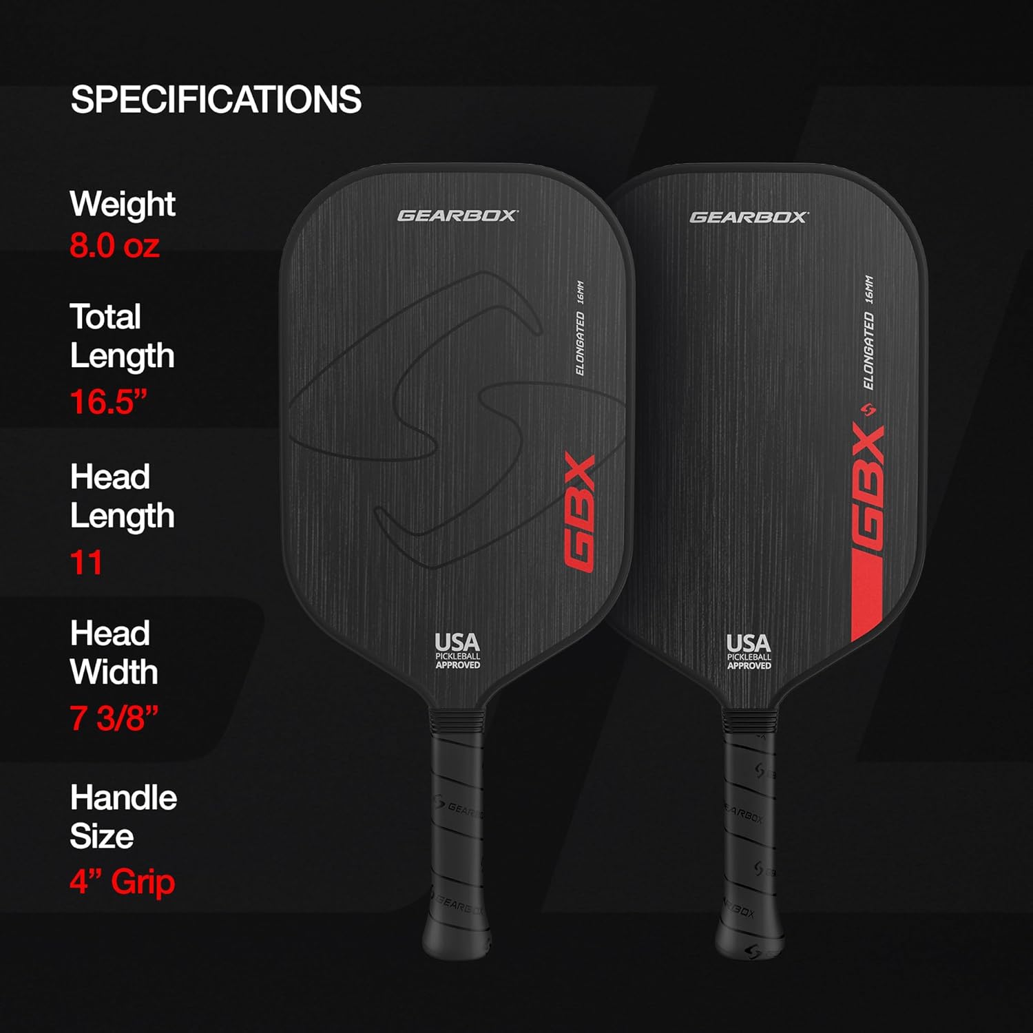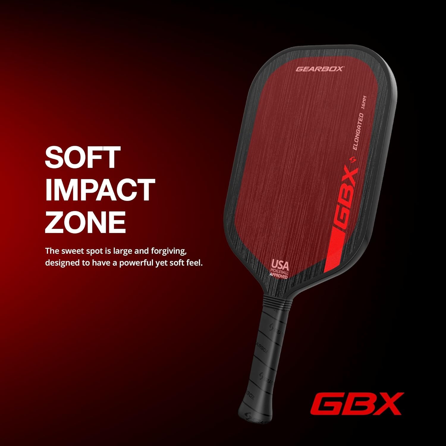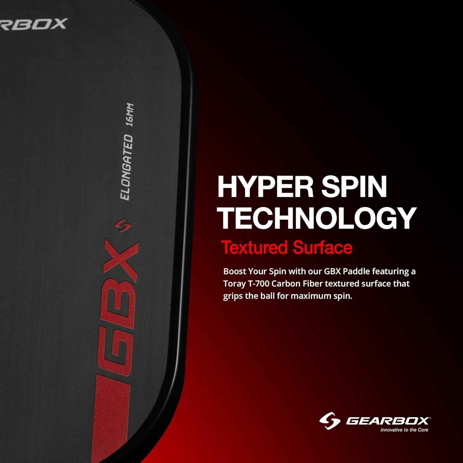ake your pickleball game to the next level with the Gearbox GBX Elongated Pickleball Paddle, designed for players who demand power, precision, and spin. Engineered with a 16mm polypropylene core and a Toray T-700 carbon fiber face, this paddle delivers exceptional durability, responsiveness, and control.